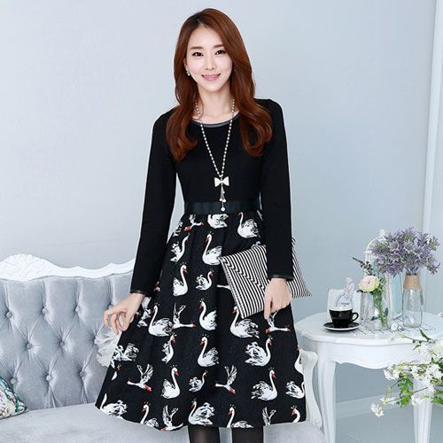 【NINI OL】大尺碼-圓領長袖收腰撞色拼接小天鵝連衣裙