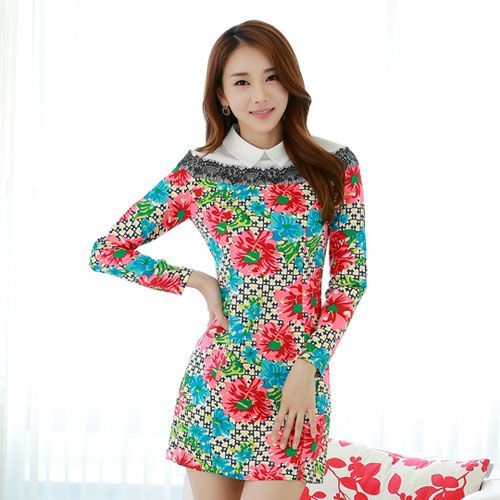 【NINI OL】大尺碼-大氣印花拼接花邊襯衣領長袖連衣裙