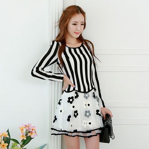 【NINI OL】大尺碼-清新條紋超顯瘦撞色包條歐根紗印花連衣裙